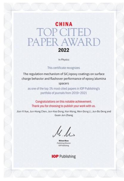 张冠军教授和邓军波副教授团队在Journal of Physics D: Applied Physics发表的研究论文“不同SiC颗粒尺寸的SiC/环氧复合材料涂层氧化铝/环氧复合绝缘子表面电荷输运特性与闪络机理”(Surface charge transport behavior and flashover mechanism on alumina/epoxy spacers coated by SiC/epoxy composites with varied SiC particle size)获得IOP Publishing的前1%高被引荣誉。美女直播