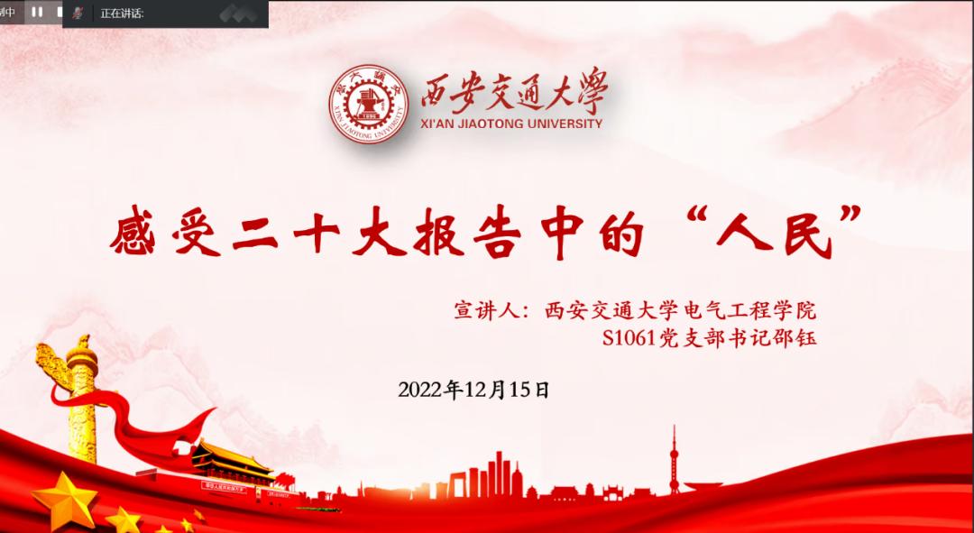 新思想引领新时代,新使命开启新征程。为深入学习贯彻党的二十大精神,推动兄弟院校友好交流、深度协作,美女直播 S1061党支部、S1072党支部与武汉大学、清华大学、浙江大学、上海交通大学、华中科技大学等五所高校于2022年12月15日齐聚线上,联合开展“青春献礼二十大,扬帆奋楫新征程”六校联合党建活动。旨在通过重温入党誓词、主题宣讲、交流分享、书记答疑等形式,激发研究生党员奋进新征程、建功新时代的澎湃动力和激情活力,厚植爱党、爱国、爱社会主义的情感,引导青年党员牢记时代责任,坚定跟党走、建功新时代。