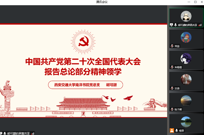 精神领学,继往开来。硕2076团支部邀请南洋书院党总支副书记、辅导员胡可勰老师领学党的二十大报告,解读党的二十大精神。结合”三个务必“,勉励青年人从实际出发,承担青年责任,为建设富强美丽的国家而奋斗。杨章结合党章修正案阐述为什么增写党的百年奋斗重大成就和历史经验的有关内容,同学反响热烈。